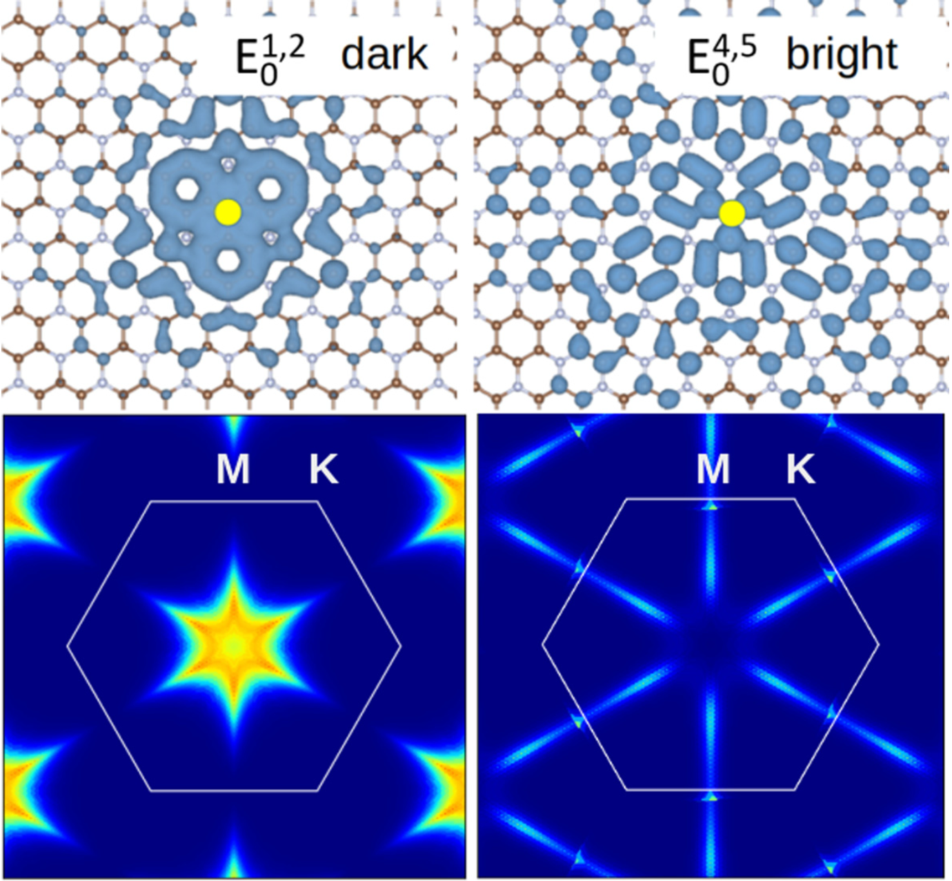 Figure 2: Visualization in both, real and reciprocal space of the lowest energy excitons in 2D C3N, obtained using the aiida-yambo plugin. The accurate GW and BSE calculations enabled by the plugin provided detailed insights into excitonic effects in this material.